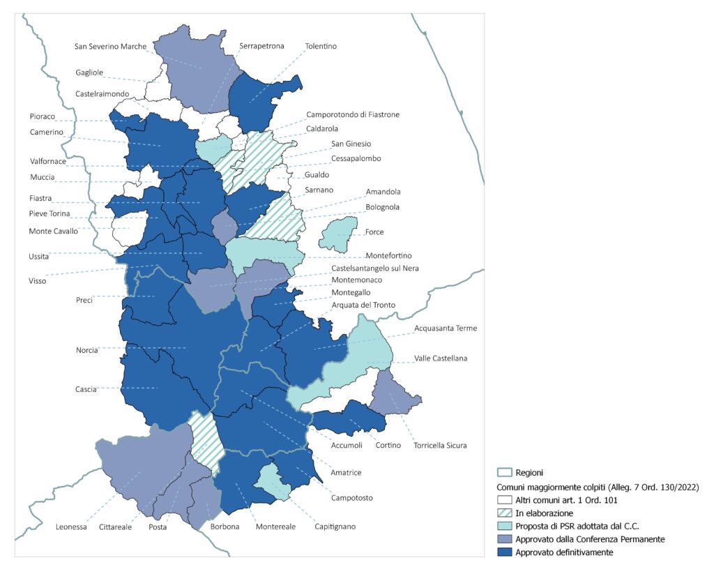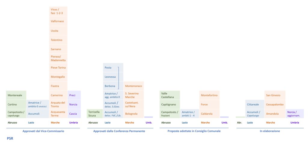 In tal senso, rispetto allo strumento introdotto dal DL 123/209, l’ordinanza 107/2020 prima, ed il Testo unico della ricostruzione privata poi (Ord. 130/2022, artt. 108-112) definiscono una nuova fisionomia giuridica e tecnica del PSR che diventa più simile a uno strumento di pianificazione strategica, dunque con forte incidenza sulle scelte di progettazione del territorio, che assume contenuti programmatori rilevanti e qualificanti, applicabili a seconda dei casi a territori di rilevanza sub-comunale, comunale e/o sovra-comunale. Infatti, l’art. 109, sesto comma, del Testo Unico della ricostruzione privata evidenzia le potenzialità della dimensione intercomunale del PSR, che può diventare carattere distintivo e qualificante di questo strumento, orientandolo verso i più innovativi esperimenti di progettazione urbanistica intercomunale.